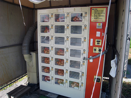 In Japan there are many vending machines that sell produce such as fruit, vegetables and even eggs fresh from the farm. Regardless of what is being sold, their design generally features a series of doored compartments with the products inside, with customers paying and then pressing the button next to the compartment that contains what they want in order to get it. Certainly one of the more mundanely useful Japanese vending machines, although it is allegedly possible to accidentally open the door of a compartment that is already empty.