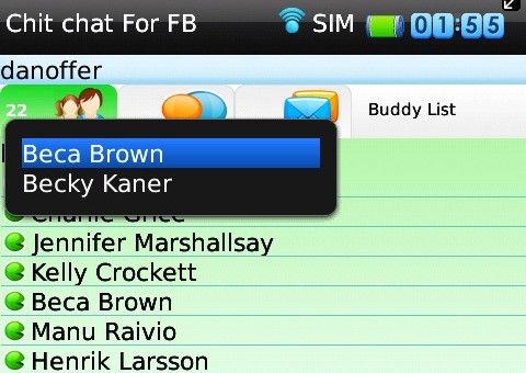 The ‘buddies’ tab displays a list of online friends. Online friends are marked with a green symbol, and idle friends are marked yellow. Chit Chat for Facebook (Blackberry) allows the user to toggle whether or not they wish to see offline friends included in the list.
