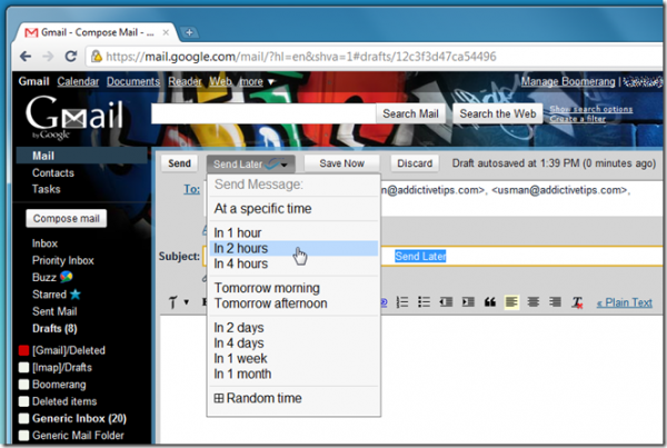 After the extension is installed on user’s browser, may it be Google’s Chrome or Mozilla’s Firefox, whenever you read an email you will come across a Boomerang dedicated menu on the top toolbar. Boomerang menu is a pull down menu with the intention of controlling a number of options including the time settings for receive part of the service. For example, the user can delay the delivery time from 1 hour to a huge amount of 1 month. Similarly, the options are available to send the email on the defined time and receive them on a specific time slot as well. At the top of menu tab, Manage option is available that helps you to manage timings for both sending and the receiving emails. Users can enter a dedicated schedule and even alter the schedule that they have set previously. Although, application is in beta stage but it works fine with both, Google Chrome and Firefox.
