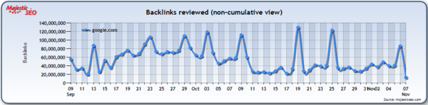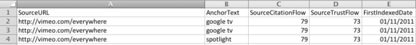 A typical backlink graph given by Majesticseo is shown above. This graph shows the amount of backlinks heading into a site over the course of a few years, this is given alongside the comprehensive list of backlinks (the snapshot shown below), which can be downloaded as a .csv file.