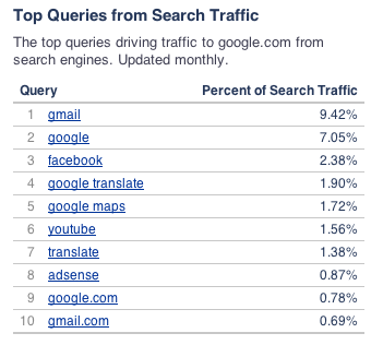 One other worthwhile, and most importantly free tool that can be used to get an insight into what keywords a site may be targeting can be gained from a tool from Alexa.com. Alexa allows you to view the top queries from search traffic. Simply enter a competitors website, click the ‘get details’ button and you shall see the information pop up in front of you. You should be looking for the table titled ‘Top Queries from Search Traffic’ this table should be listed about half way down the page and looks like the one shown below.