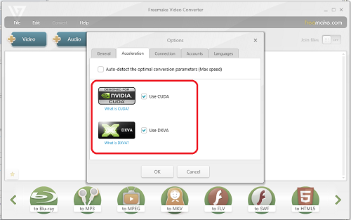 DXVA (DirectX Video Acceleration) is Microsoft’s technology that uses graphics card resources to assist with video decoding (CUDA deals with video encoding). In Freemake Video Converter DXVA is used for decoding of video with H.264 and MPEG2 video codecs. It allows users to boost conversion of HD and DVD video by 50%.