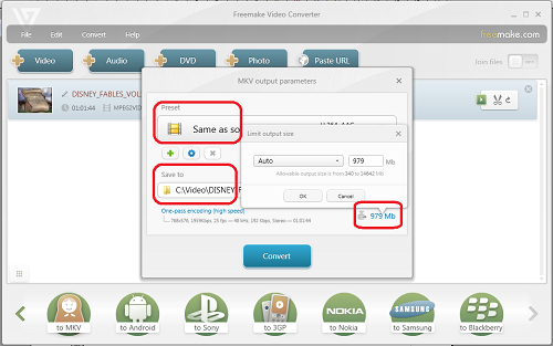 As DVD videos have MPEG2 codec, so DXVA is to work. Now choose the output format which offers H.264 as the video codec. These are AVI, MP4, MKV. Pick up the preset “Same as source” and choose the destination. The video converter will inform you about the output file size. If you find it excessive, you can reduce it by clicking the “weight” icon. Still remember that this will affect the video quality since the bitrate will be automatically lowered. When you’re ready, click “Convert”.